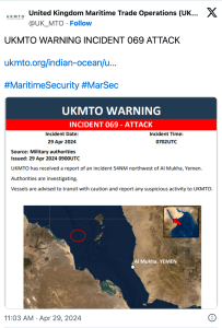 Die Houthi-Terroristen haben fünf Drohnen in Richtung Rotes Meer und Israel abgeschossen. Diese wurden von US-amerikanischen Abfangsystemen neutralisiert. Die Drohnen hätten, so wurde betont, eine grosse Bedrohung für alle in der Region segelnden Schiffe bedeutet. «Unsere Aktionen, die Drohnen abzufangen, sind wichtig, um die Bewegungsfreiheit und Sicherheit der Schifffahrt in der Region zu garantieren. Das gilt sowohl für unsere eigenen Schiffe als auch für die der Koalition und die Handelsschiffe.» Zwei Stunden später meldete die ‘UK Maritime Trade Operations’ dass es einen Vorfall etwa 54 sm nordwestlich von Mokha gegeben habe, ohne allerdings weitere Einzelheiten bekanntzugeben. Mittlerweile wurde bekannt, dass es sich bei dem Containerschiff um ein unter maltesischer Flagge segelndes Schiff handelt, das unterwegs von Djibouti nach Jeddah, Saudi-Arabien war.