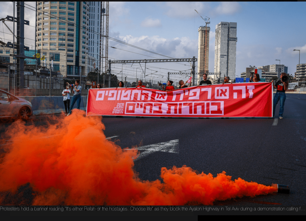 Familienangehörige und Freunde haben heute Vormittag erneut den Ayalon, der die wichtigste Transversale durch Tel Aviv ist, blockiert. Sie trugen Plakate mit der Aufschrift «Entweder Rafah oder die Geiseln – entscheidet euch für das Leben!»