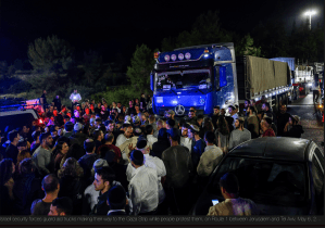 Mitglieder der Aktivistengruppe Tzav 9 haben in der Nacht die Latrun Kreuzung kurz vor Jerusalem auf der Schnellstrasse 1 blockiert. Sie hinderten damit einen Konvoi mit Hilfsgütern daran, seinen Weg nach Gaza fortzusetzen. Zuvor hatten sie noch andere Kreuzungen im Bereich der Stadtumfahrung blockiert.