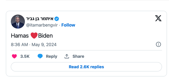 Die gesamte Opposition forderte den rechtsextremen Ben-Gvir unisono auf, sofort zurückzutreten und bezog sich dabei auf seine schandbare Mitteilung gegen US-Präsident Joe Biden. Die Politiker gaben ihrer Sorge Ausdruck, dass alles, was von der Unterstützung und pro-Israel Stimmung in der US-amerikanischen Politik noch übrig sei, vernichtet werde. «Wenn Netanyahu Ben-Gvir heute nicht feuert, gefährdet er jeden Soldaten der IDF und jeden Bürger im Staat Israel.» erklärte Oppositionsführer Lapid. Später forderte er Yoav Gallant, Benny Gantz und Gadi Eisenkot dazu auf, Netanyahu zu drängen, Ben-Gvir aus dem Amt zu entfernen.