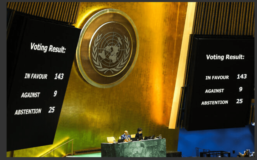 Mit dem beschämenden Ergebnis von 143 Stimmen für und nur 9 Stimmen gegen den Antrag auf Vollaufnahme der Palästinenser in die UNO wurde dieser angenommen. Abgelehnt haben: Argentinien, Tschechien, Ungarn, Israel, Mikronesien, Nauru, Papa Neu Guinea, Palau und die USA. Zahlreiche EU-Staaten stimmten für den Antrag. 25 Staaten enthielten sich der Stimme.