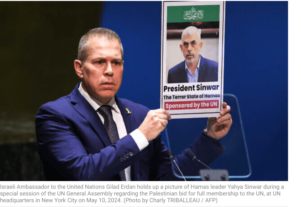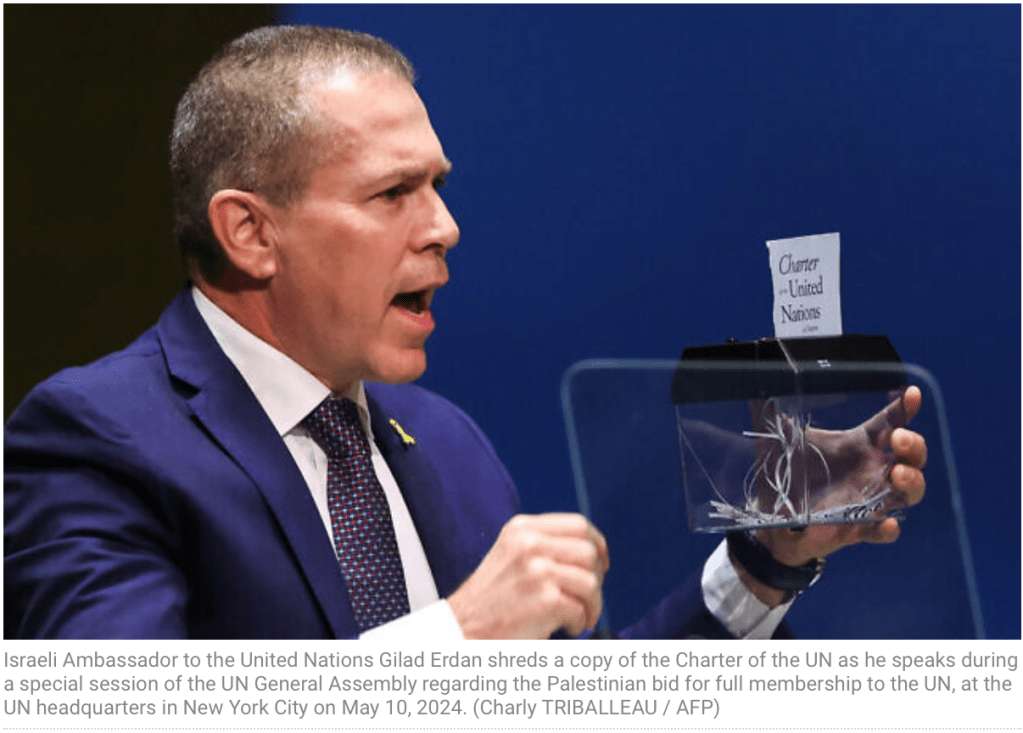 Der israelische Botschafter zur UNO, Gilad Erdan, schredderte eine Kopie der UN-Charta, um zu zeigen, was damit geschehen ist. Sie besagt u.a., dass die UNO ‘friedliebenden Staaten’ offensteht. Dass ein zukünftiges Palästina nicht dazu gehört, ist klar. Erdan zeigt seine Horrorvision denn auch auf einem Plakat.