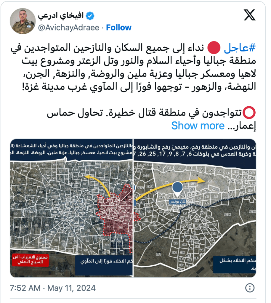 Die IDF hat die Bewohner von weiteren Quartieren im östlichen Rafah aufgefordert, sich in die humanitären Zonen westlich von Khan Younis und al-Mawasi zu evakuieren. Bisher sind bereits etwa 300.000 der mehr als 1.3 Millionen Menschen aus dem gesamten Ortsgebiet von Rafah evakuiert worden.