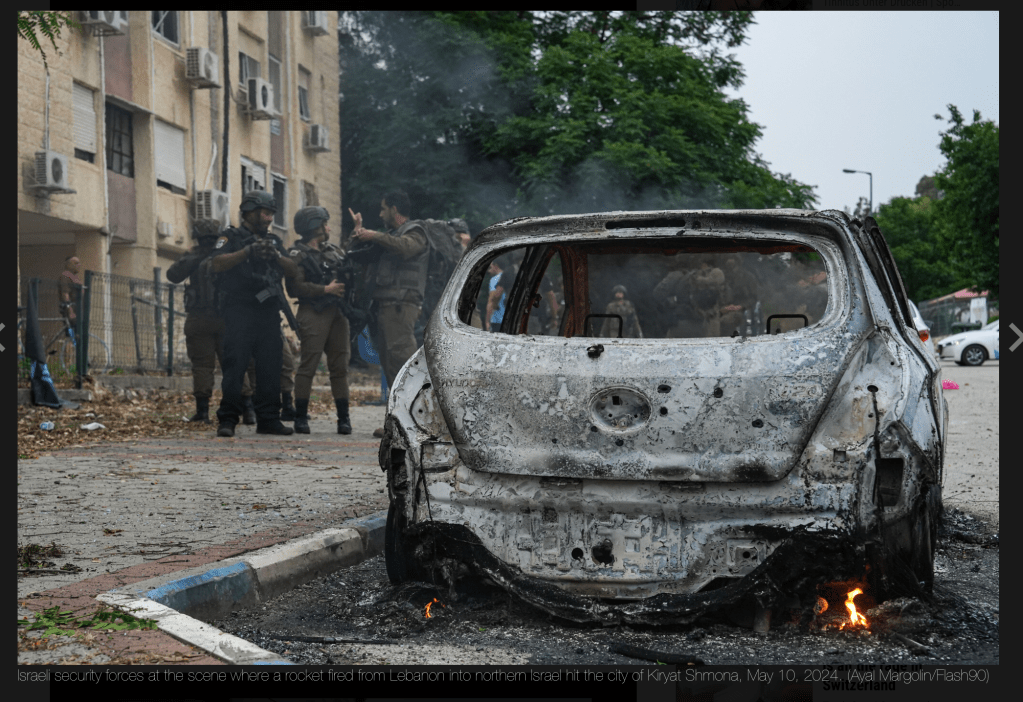 Gestern schoss die Hisbollah 35 Raketen aus dem südlichen Libanon auf Kiryat Shmona, 15 davon konnten abgefangen werden. Einige Raketen schlugen in der Stadt ein und verursachten dort teils grossen Sachschaden. In der Umgebung der Stadt brachen einige Brände aus, die von zehn Feuerwehren gelöscht wurden. Auch im Kibbutz Misgav Am wurde ein Gebäude getroffen, dort entstand aber nur geringer Schaden.