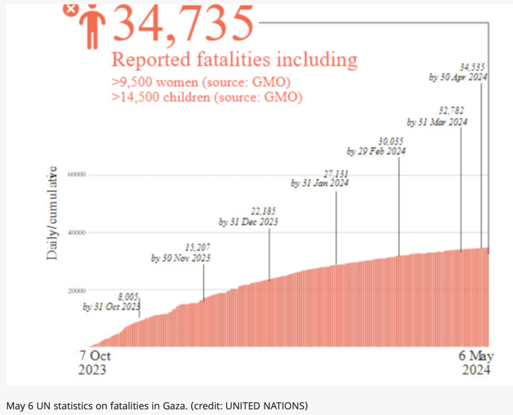 Die UNO hat offensichtlich die Zahl der bisher im Laufe des Krieges getöteten Frauen und Kinder deutlich nach unten korrigiert. Die am 6. und 8. Mai veröffentlichten Daten zeigen, dass sich die Zahlen gegenüber anderen Veröffentlichungen durch das ‘Gesundheitsministerium’ und die Medienstelle der ‘Regierung’ halbiert haben. Allerdings gibt die UNO zu, bisher nicht in der Lage zu sein, unabhängige und überprüfte Zahlen zu liefern. So seien von der mit 34.844 bezifferten Gesamtzahl 40% Männer, 32% Kinder und 20% Frauen. Das in Washington ansässige ‘Institute for Near East Policy’ stellt klar, dass die vorliegenden Zahlen aus Gaza eindeutig manipuliert seien. Es bezieht sich dabei auf die auffallende Regelmässigkeit im Anstieg der Opferzahlen, was absolut atypisch für einen Krieg ist. Dazu dürften eine recht grosse Zahl der als ‘Kinder’ bezeichneten Opfer tatsächlich minderjährige, von der Hamas angeworbene junge Kämpfer sein.