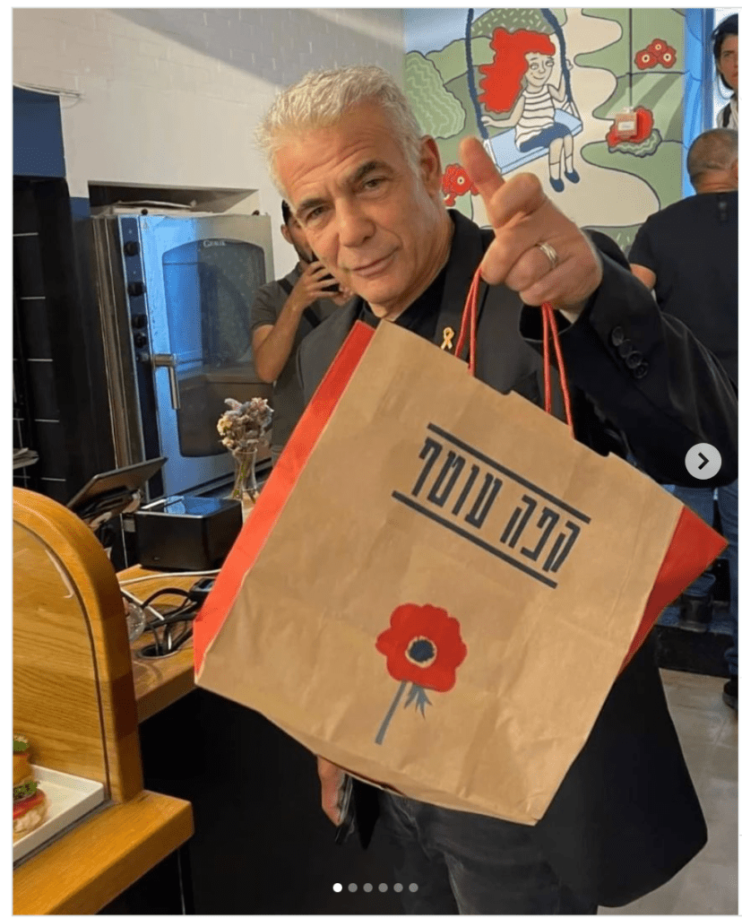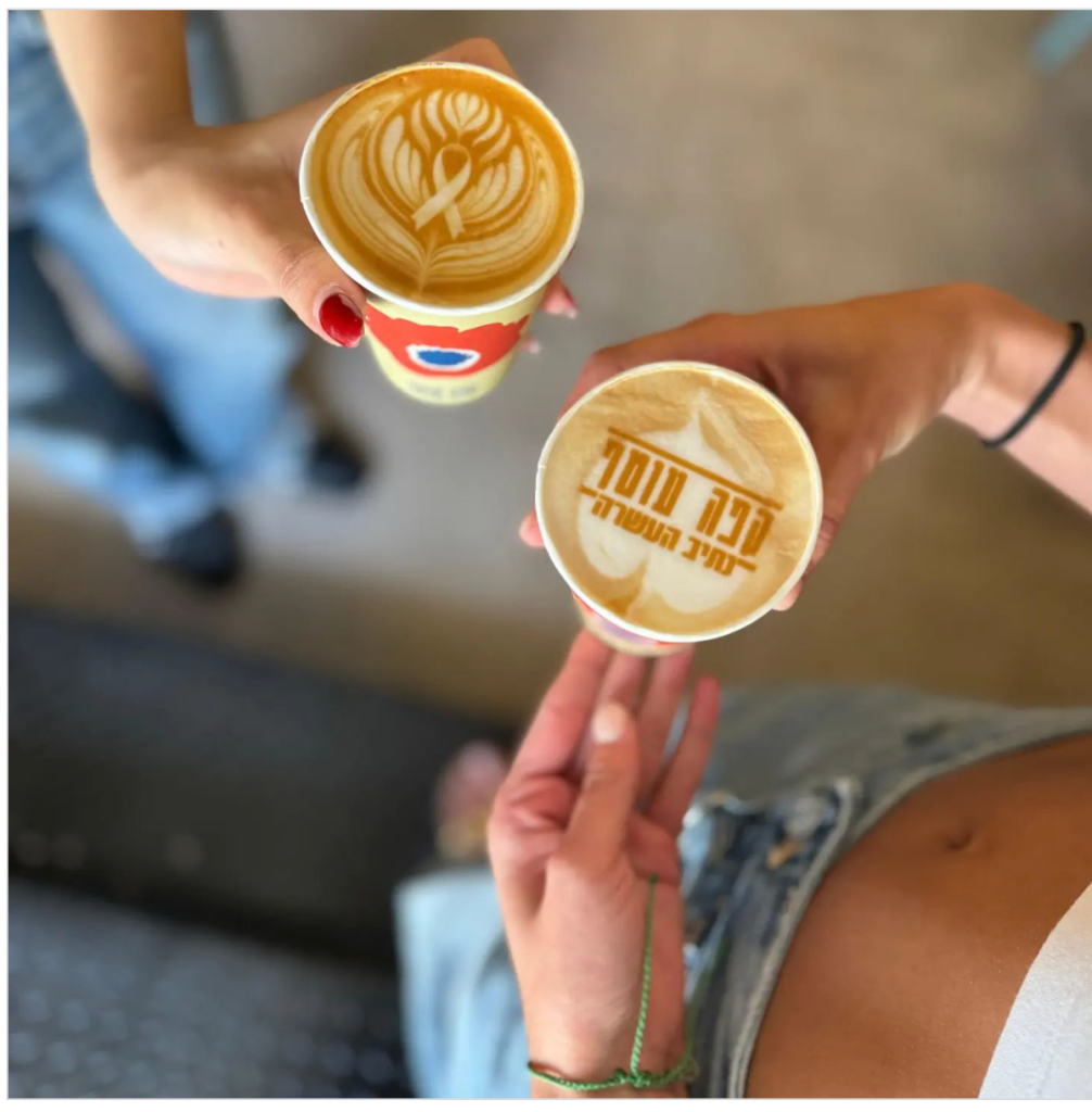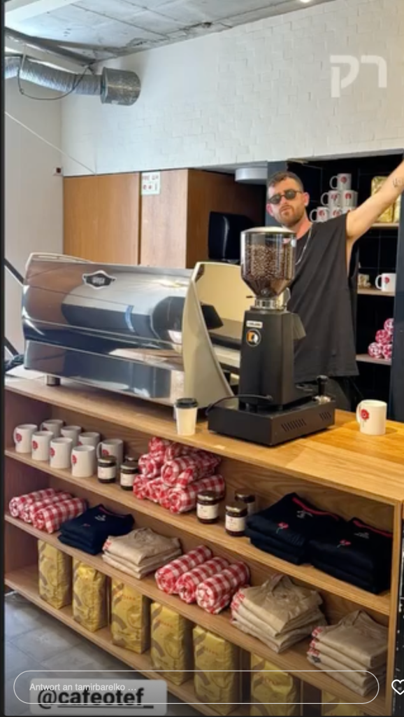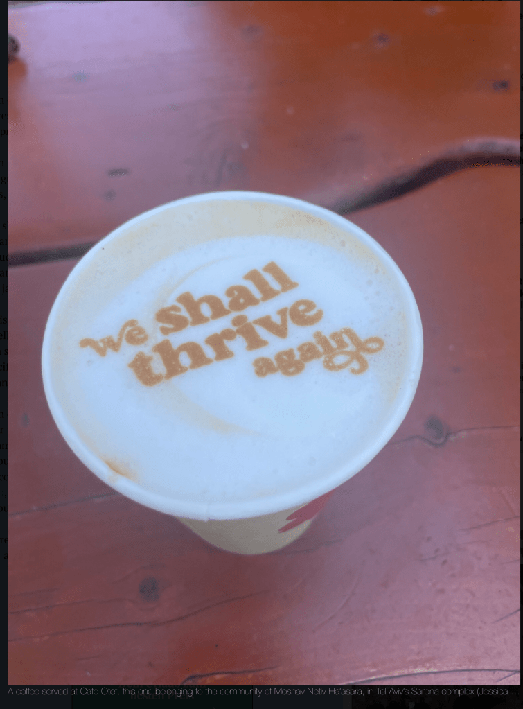Die gute Nachricht: Mitten im beliebten undtrendigen Sarona Gebiet in Tel Aviv findet man das ‘Café Otef’. עוטף עזה ‘Otef Aza’ ist die Bezeichnung für die Gemeinden, die sich wie ein Umschlag oder Gürtel rings um den Gazastreifen befinden. Tamir Barelko, umtriebiger Gastronom und Betreiber der ‘Arcaffe-Kette’ wurde nach dem 7. Oktober zum Aktivisten. Die rote Anemone, Symbol für die blühenden Anemonenfelder im Negev, wurde zum Symbol für dieses Projekt. Im Shop gibt es Weine aus dem Süden, Blumen, Bücher, Konfitüren aus Jad Mordechai (Ich liebe sie, ganz besonders die Etrog Konfitüre!!!), Schokolade von Dvir Karp, der während des Massakers ermordet wurde und andere Produkte, die an jene Gebiete erinnern, die während der Massaker am stärksten betroffen waren. Auf jeder Verpackung findet man die Anemonen-Blüte. Sogar auf dem Schaum des Cappuccinos lacht sie den Geniesser an.