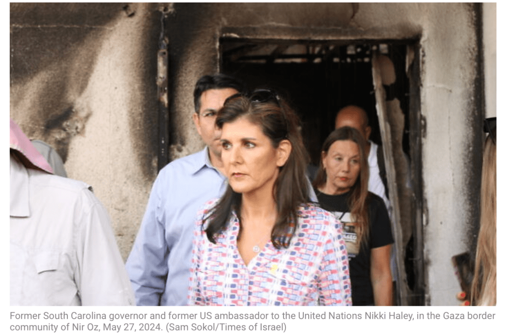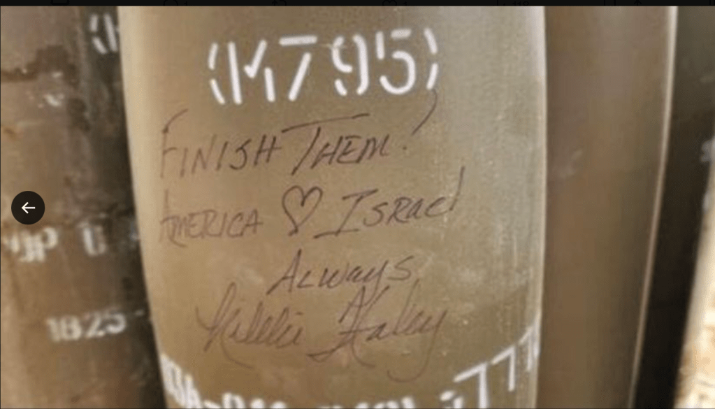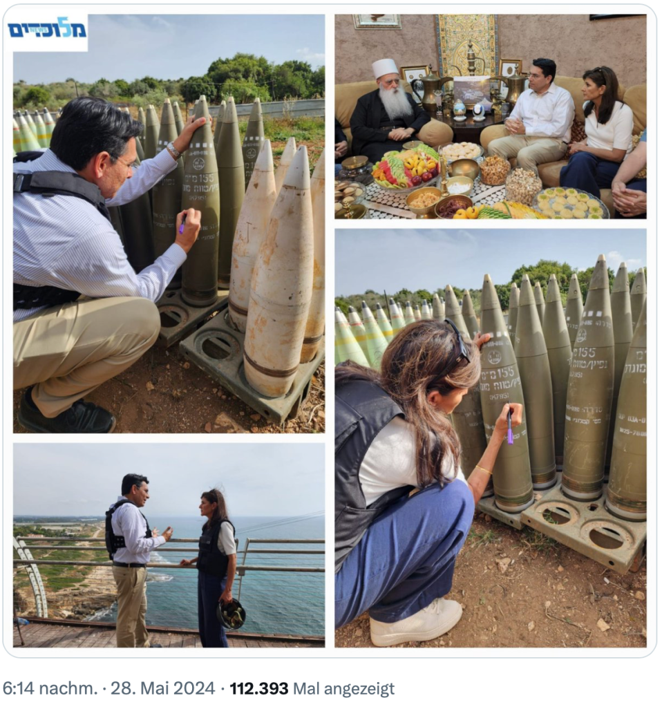 Nikki Haley, 52, gescheiterte Präsidentschaftskandidatin, befindet sich derzeit zu einem halb-privaten Besuch in Israel. Begleitet wird sie bei ihren Fahrten in den Süden des Landes von Dany Danon, Likud. Danon war von 2015 – 2020 der ständige Vertreter Israels bei der UNO. Bei einem Besuch im Süden des Landes schrieb sie auf eine Bombe «Macht sie fertig! Amerika liebt Israel». Im Norden des Landes hielt sie fest: «Amerika steht zu Israel und steht an der Seite Israels. Israel kämpft heute gegen die Feinde der USA. Hört nicht auf, bis ihr gewonnen habt.» Der Spruch, den Hailey auf die Bombe schrieb, löste in Israel sehr gespaltene Reaktionen aus. Sie gingen von ‘Kriegstreiberin’ auf der einen Seite, bis zum Dank für die Unterstützung auf der anderen.