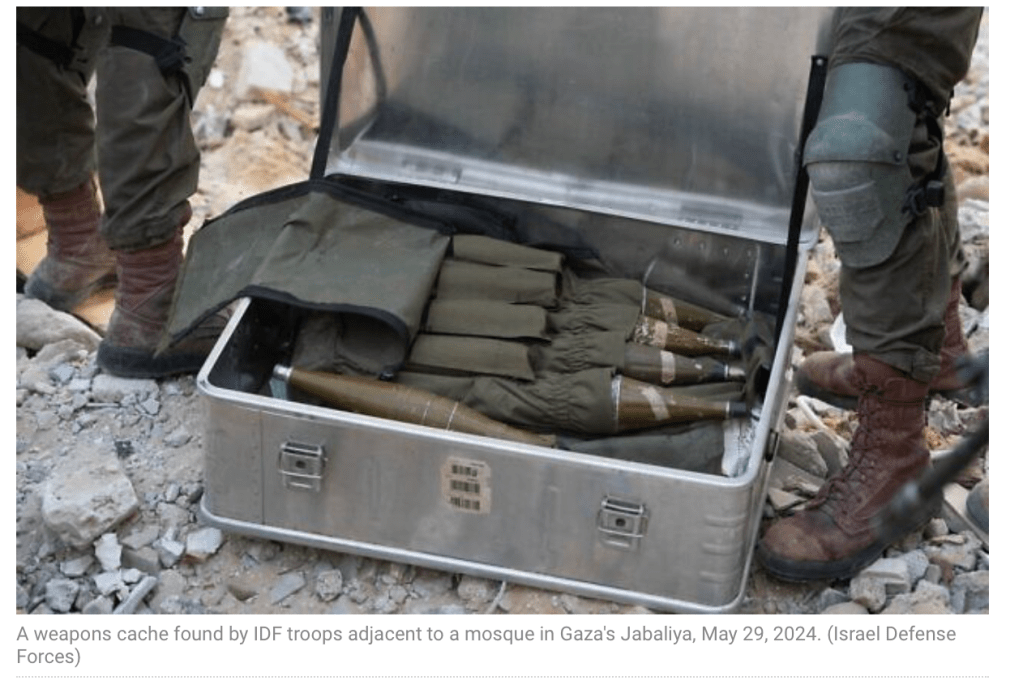 Erneut fand die IDF Waffen in einer Moschee in Jabaliya. Zuvor waren Drohnen-Aufnahmen veröffentlicht worden, die einen Luftangriff gegen einen mit Panzerfäusten bewaffneten Terroristen zeigen. Es ist das der vorerst letzte Angriff gegen die IDF mit Panzerfäusten in Jabaliya, die in den vergangenen Wochen massiv zugenommen haben.