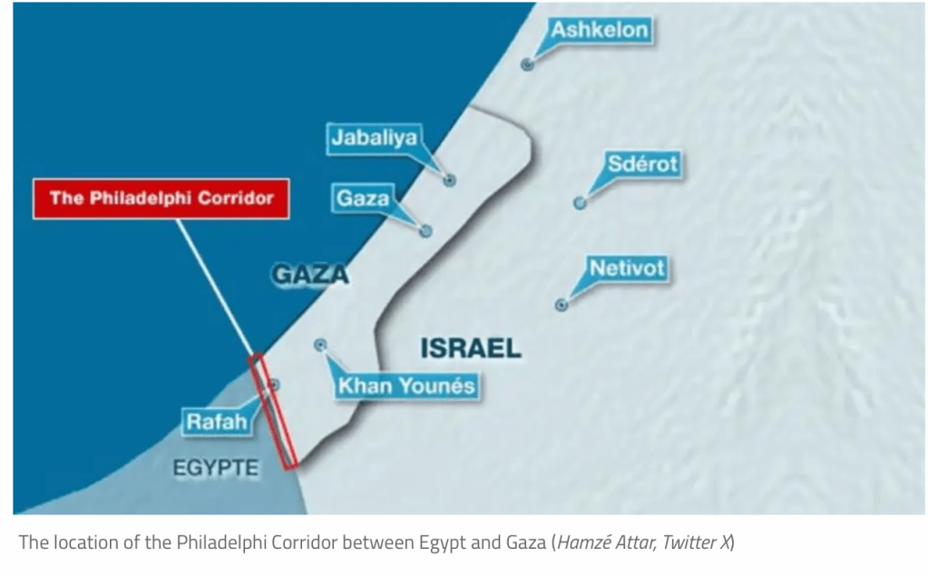 John Kirby, Sprecher der nationalen Sicherheit in den USA betonte, dass die Kontrolle über den Philadelphi-Korridors zwischen Ägypten und Gaza nicht die von US-Präsident Joe Biden gezeichnete ‘rote Linie’ überschreitet. Der Philadelphi-Korridor ist die am meisten genutzte Schmuggel-Route für Waffentransporte nach Gaza. Ob die IDF dabei den ganzen strategisch wichtigen Korridor besetzt hat oder nur Teilstücke, wird von ihm nicht angesprochen. Kirby betont, dass die IDF die Operation zuvor den USA kommuniziert hat. Bisher wurden von der IDF mindestens 20 grenzunterscheitende Tunnel gefunden. Einige davon waren der IDF bekannt, andere wurden erstmals entdeckt. In das Tunnelsystem hinein führen mindestens 82 Einstiege, die über das ganze Gebiet des Korridors verteilt sind.