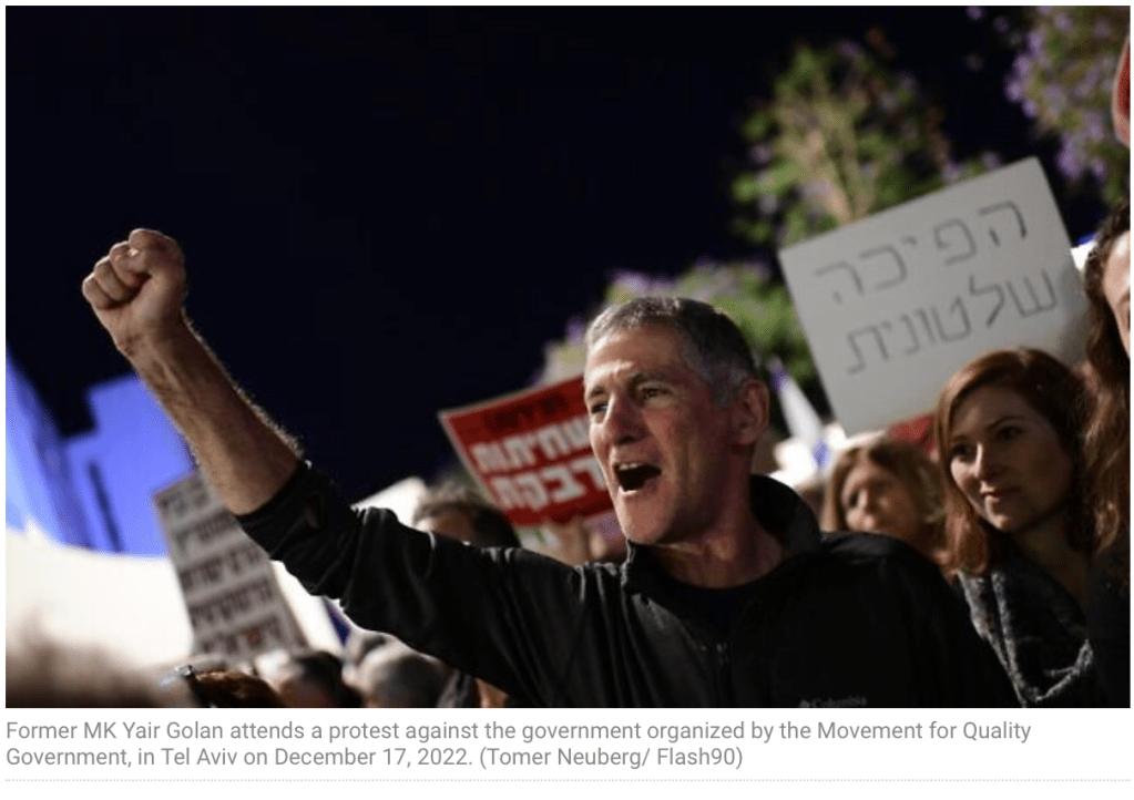 Kaum im Amt, muss sich der neugewählte Vorsitzende der Arbeiterpartei, Yair Golan, schon mit dem Schmierentheater der rechten und rechts-extremen Politiker der Koalition auseinandersetzen. Golan, ein ehemaliger General der IDF, ist seit 2022 die Stimme des gewaltfreien zivilen Ungehorsams gegen die Regierung. Der Fokus der Proteste lag dabei auf den Plänen, die Gewaltenteilung abzuschaffen und damit die Demokratie zu gefährden. Die Vereinigung israelischer Reservisten, ‘Brothers & Sisters in Arms’, hatte damals damit gedroht, keine Reserveübungen mehr wahrzunehmen.
