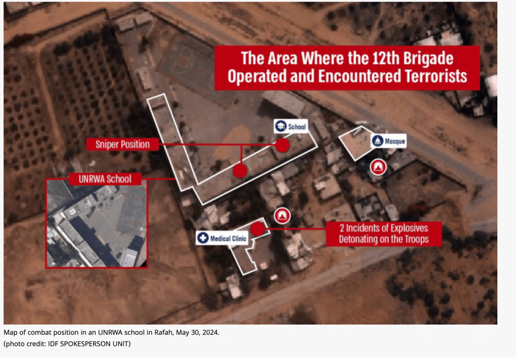Jene Explosion, bei der am Dienstag drei Soldaten ihr Leben verloren, wurde ausgelöst durch einen verminten Tunneleinstieg, der sich unterhalb einer zivilen Klinik befand. Die Klinik ist Teil eines UNWRA Komplexes, der neben der Schule, eben auch die Klinik und eine Moschee umfasst. In den Klassenräumen der Schule wurden zahlreiche Waffen und Uniformen aufgefunden. Auch zahlreiche Tunneleingänge befanden sich in den Klassenzimmern. Ein klassischer Stützpunkt der Hamas in einer UNRWA-Anlage!