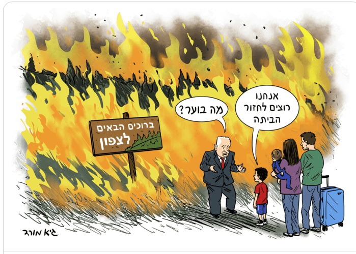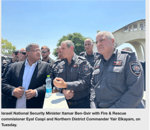 Während im Norden des Landes die Feuer wüten, nimmt der oberste Dienstherr der Feuerwehr, der rechtsextrem-nationalistische Ben-Gvir an einer nicht näher definierten Veranstaltung in Jerusalem teil. Kein Wunder, dass Oppositionsführer Yair Lapid wieder einmal Kritik äussern muss: «In der Geschichte des Landes hat es noch nie eine rücksichtslosere Regierung gegeben. Sie kümmert sich einfach nicht. Weder um den Norden, noch um den Süden, noch um die Geiseln.» Vielleicht als Reaktion auf diese berechtigte Rüge von den Oppositionsbänken liess sich Ben-Gvir heute in Kiryat Shmona von Feuerwehrkräften über die Lage in den Brandgebieten unterrichten. Dort forderte er wortgewaltig und grossmäulig wie immer in Richtung Hisbollah: «Sie verbrennen unseren Boden, wir müssen alle Hisbollah Hochburgen verbrennen. Zerstört sie! Krieg!» Das fordert ausgerechnet der Mann, der auf Grund seiner eigenen terroristischen Vorgeschichte vom Dienst in der IDF ausgeschlossen wurde. Der keine Ahnung hat von Politik, von Diplomatie und vom Krieg. Der Mann, der die grösste Fehlbesetzung auf einem Stuhl in der Knesset ist, die es jemals gab.