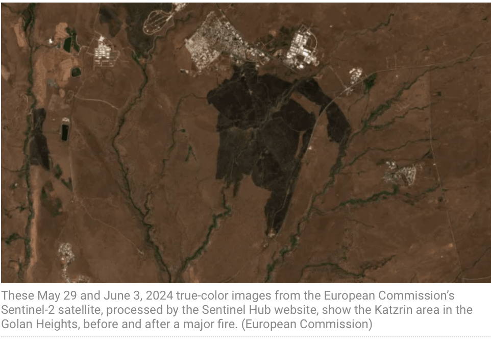 Satellitenbilder zeigen das Ausmass der Schäden, die durch das Feuer bei Katzrin entstanden sind. Der Brand war nach einer Salve von Raketen ausgebrochen und konnte erst nach einem Tag von mehreren Feuerwehren gelöscht werden. Weitere Feuer in der Nähe von Kiryat Shmona und Kfar Giladi konnten schnell unter Kontrolle gebracht werden. Bis zu 30 Feuerwehren waren an den verschiedenen Einsatzorten aktiv. Unterstützt wurden sie von zahlreichen Rettungsteams. Die extreme Hitzewelle, die derzeit im Land herrscht, tat das Ihre, um die Löscharbeiten zu erschweren. Bis Mitternacht mussten schon sechs Reservisten und fünf Zivillisten mit Rauchgasvergiftungen ins Spital eingeliefert werden.