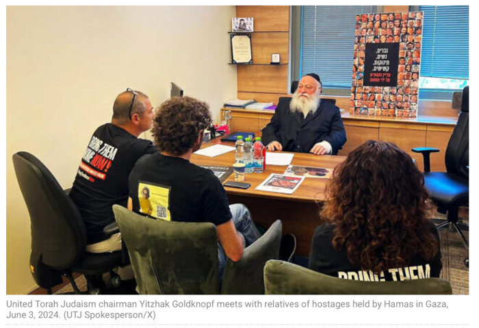 Die ultra-orthodoxe Shas Partei (Vorsitzender Arje Deri) mit elf Sitzen ist die grösste Einzelpartei nach dem Likud von Netanyahu in der Koalition. Zweitgrösste Einzelpartei ist United Torah Judaism (Vorsitzender Yitzhak Goldknopf) mit sieben Sitzen. Yitzhak Goldknopf traf sich heute mit Vertretern von der Familienangehörigen von Geiseln. Die beiden orthodoxen Parteien haben ihre volle Unterstützung des vorgelegten Vorschlags zum Geisel-Abkommen zugesagt.
