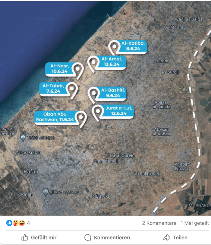 Im Zusammenhang mit der Geiselbefreiung von gestern Vormittag verbreitet die palästinensische Terror-Organisation Hamas eine Lüge nach der anderen. So liess sie gestern verlauten, die Spezialkräfte, die Operation in Nuseirat durchgeführt haben, wären mit einem Transporter für humanitäre Lieferungen nach Gaza gekommen. In einer zweiten Version hiess es, sie hätten den schwimmenden Pier, der von den Amerikanern vor Gaza errichtet wurde, dafür benutzt. Der arabisch sprechenden IDF-Sprecher Avichay Adraee dementierte beides und hielt fest: «Unsere Spezialeinheiten haben das Gebiet von Nuseirat nicht mit einem Auto oder einem Hilfstransporter betreten.» (s. Reaktionen: Francesca Albanese)