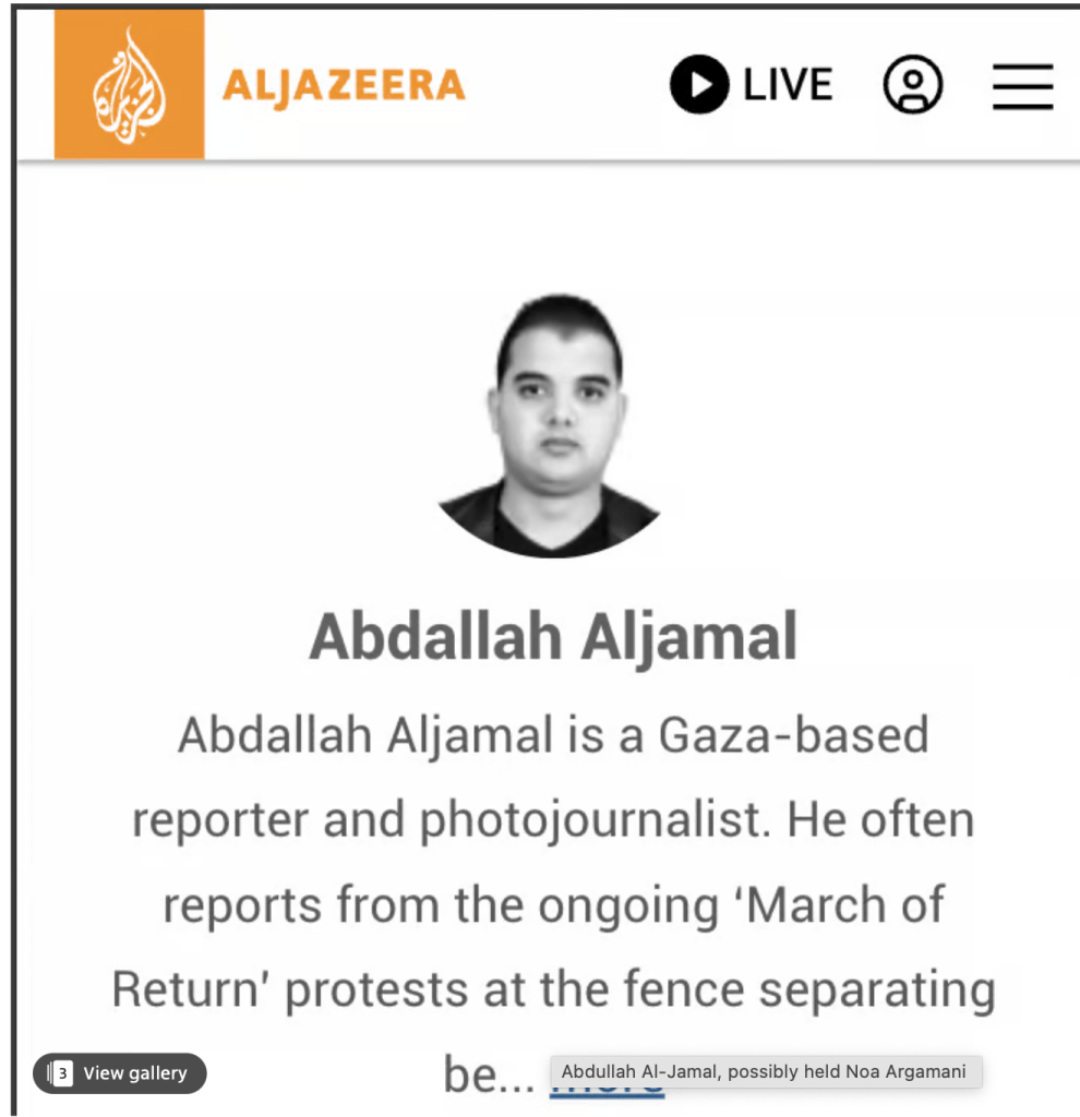 Erste Untersuchungen ergaben, dass Noa Argamani in der Privatwohnung eines mit al-Jazeera verbundenen Journalisten Abdallah al-Jamal festgehalten wurde. Al-Jazeera dementiert dies natürlich. «Wir kennen ihn nicht, und alle Gerüchte, die verbreitet wurden, sind inhaltslos und überhaupt nicht wahr.» Al-Jamal arbeitete für al-Jazeera und veröffentlichte seit dem 7. Oktober fast täglich Artikel auf Englisch in der ‘Palestine Chronicle’. Al-Jazeera lügt!