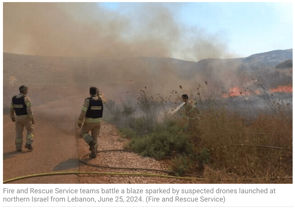 Zwei sprengstoffbeladene Drohnen aus dem Libanon wurden von der IAF abgefangen und zerstört. Herabstürzende Teil entfachten in der Gemeinde Dishon, unmittelbar an der Grenze zum Libanon, ein Feuer, fünf Feuerwehren sind vor Ort, um den Brand zu bekämpfen. Im sofort erfolgten Gegenschlag wurden militärisch genutzte Gebäude in Khiam und Odaisseh in der Nähe von Misgav Am zerstört.