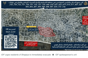 Der arabisch-sprechende IDF-Sprecher Avichay Adraee wandte sich heute Vormittag überraschend an die Bewohner von Shejaia, einem Stadtviertel von Gaza Stadt. Er forderte die Bewohner dringend auf, sich sofort über die Salah ad-Din Strasse nach Süden in die humanitäre Sicherheits-Zone zu begeben. Palästinenser sprechen von heftigem Beschuss und von über dem Stadtviertel kreisenden Hubschraubern. Von verschiedenen Richtungen nähern sich IDF-Fahrzeuge der Region.
