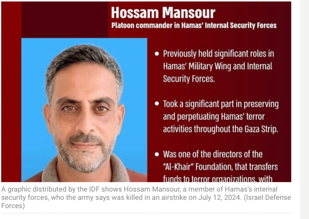 Hossam Mansour, Kommandant der internen Sicherheitsgruppen der palästinensischen Terror-Organisation Hamas, wurde bei einem gezielten Angriff neutralisiert. Seine Aufgabe war es, die Präsenz der Hamas im Gazastreifen zu sichern und gleichzeitig alle Bemühungen Israels zu untergraben. Er war auch Direktor der in Grossbritannien ansässigen Al-Khair-Stiftung, einer Hilfsorganisation, die laut Angaben der IDF unter dem Deckmantel humanitärer Aktivitäten Gelder an Terrorgruppen im Gazastreifen transferierte.