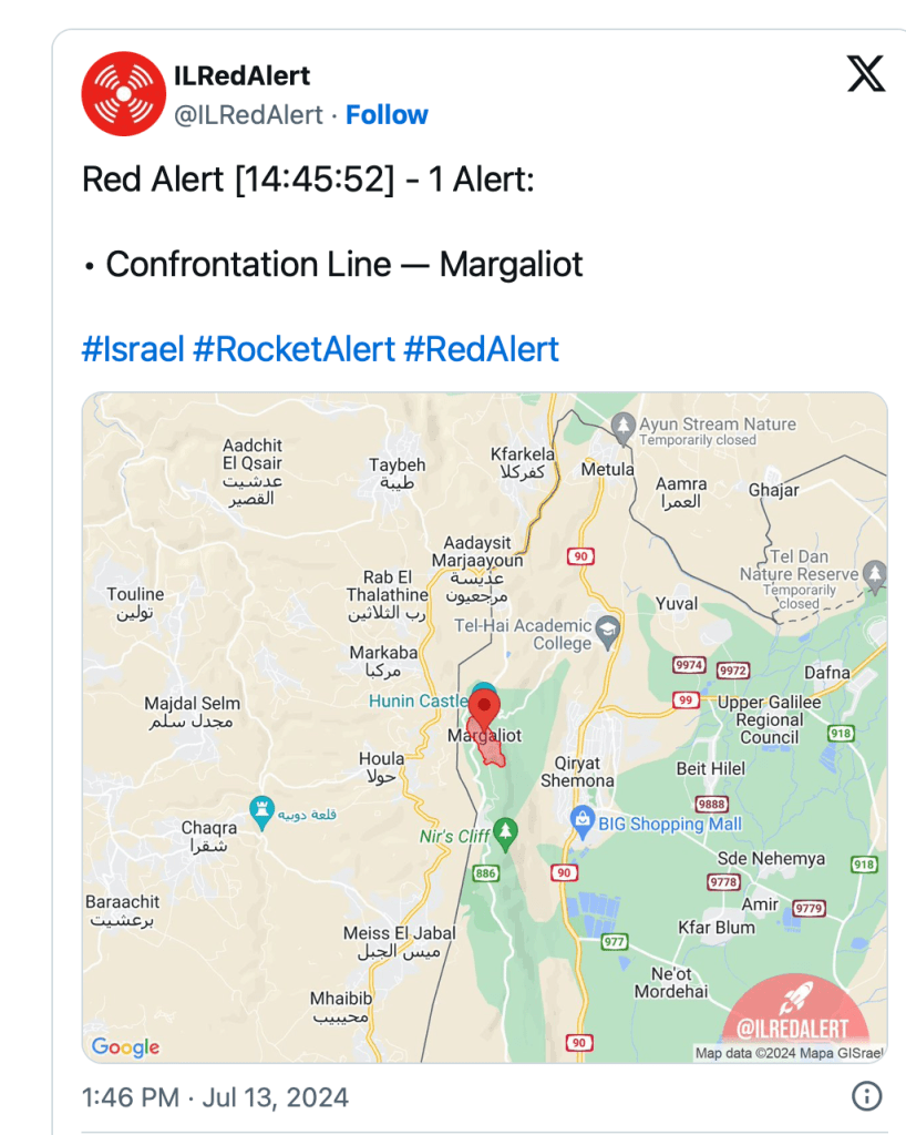 Bei einem Raketenbeschuss aus dem südlichen Libanon erlitten zwei leer stehende Häuser in Margliot, unmittelbar neben der Grenze zum Libanon, erheblichen Schaden und Feuer brach aus. Die Hisbollah rechtfertigt den anhaltenden täglichen Beschuss Israels damit, dass sie die in Gaza kämpfenden Hamas-Terroristen unterstützen wollen.