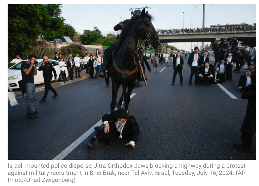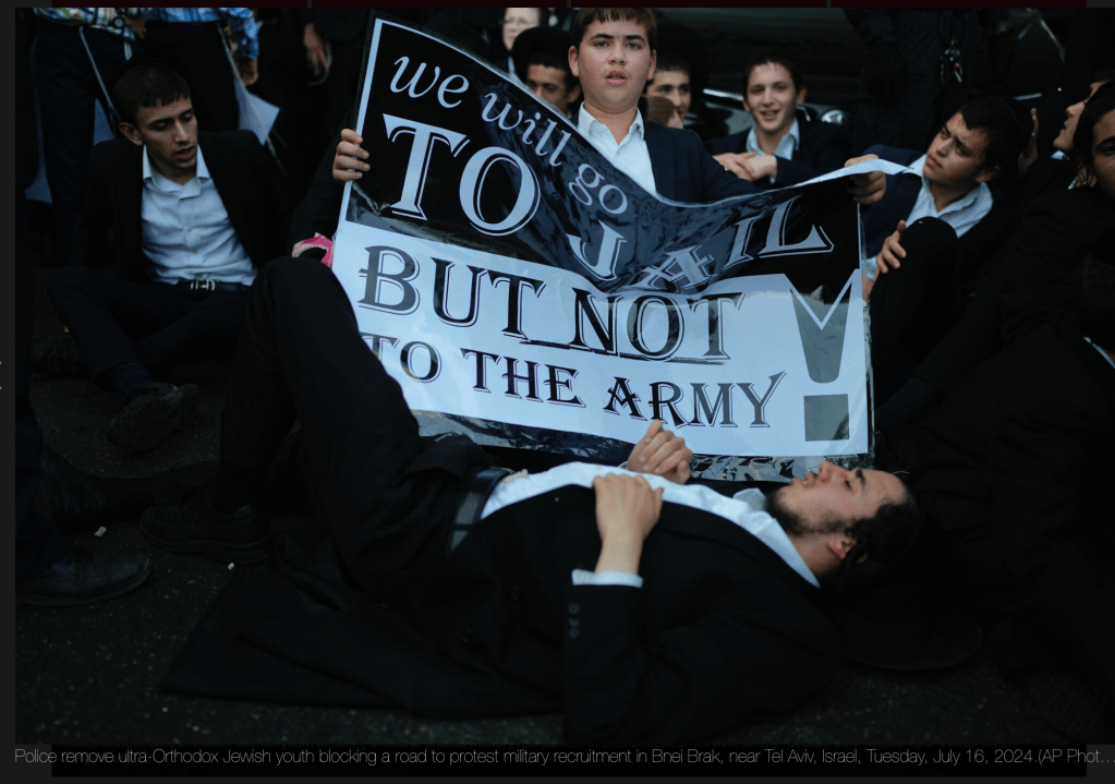 Junge Haredim, die offenbar kurz vor der Einberufung zur IDF stehen, haben gestern die zweite Nord-Süd-Schnellstrasse 4 blockiert. Sie trugen Plakate mit sich, auf denen stand: «Wir gehen ins Gefängnis, aber nicht ins Militär.» Vielleicht sollten sich die von ihren Rabbinern fehlgeleiteten Knaben einmal überlegen, wer ihr bisheriges Leben finanziert hat. Von der vorgeburtlichen Betreuung, über die Geburt und postnatale Betreuung, Beschneidung, Windeln, die Babynahrung, Kindergarten, Schule, Bar Mitzwa, Yeschiwa… sonst nennt man das Parasitentum, nur in Israel bezahlt das alles das Sozialministerium. Und dann sind drei Jahre zu viel, um ein wenig zurückzuzahlen? Die Polizei löste die Demonstration mit Wasserwerfern und berittener Polizei auf.