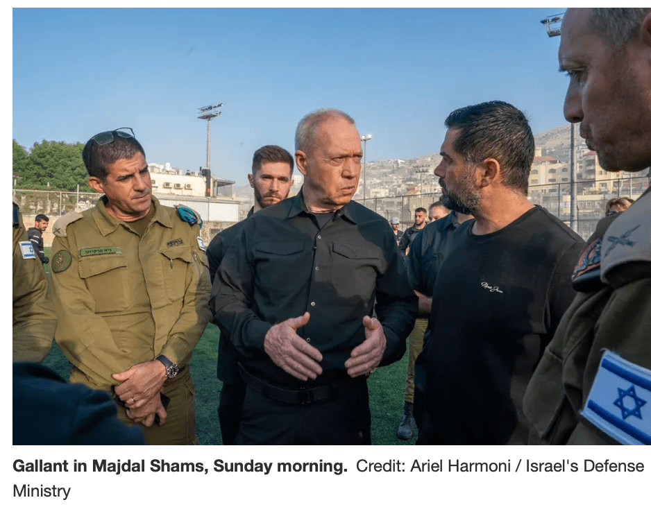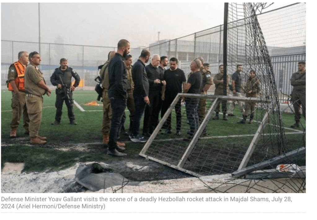 VM Yoav Gallant, Generalstabschef Herzi Halevi und Benny Gantz fuhren sofort in den Ort, der von Trauer beherrscht wird. Halevi sagte in einer Videobotschaft: «Wir wissen genau, von wo aus die Rakete abgefeuert wurde. Wir haben hier am Rand des Fußballfeldes die Überreste der Rakete untersucht und können sagen, dass es sich um eine Falaq-Rakete mit einem 53 Kilogramm schweren Sprengkopf handelt. Dies ist eine Hisbollah-Rakete. Und wer auch immer eine solche Rakete in ein Wohngebiet abfeuert, will Zivilisten töten, will Kinder töten.» und er fuhr fort: «Wir erhöhen unsere Bereitschaft für die nächste Phase der Kämpfe im Norden erheblich, da wir gleichzeitig im Gazastreifen kämpfen. Wir sind in der Lage, auch sehr weit vom Staat Israel entfernt anzugreifen. Es wird weitere Herausforderungen geben. Wir werden unsere Bereitschaft erhöhen. Wenn nötig, werden wir hart durchgreifen. Unsere Pflicht ist es, die Bewohner des Nordens sicher in ihre Häuser zurückzubringen, im gesamten Norden, in Galiläa und auf den Golanhöhen … Es ist ein schwieriger Tag – wir werden für bessere Tage arbeiten.»