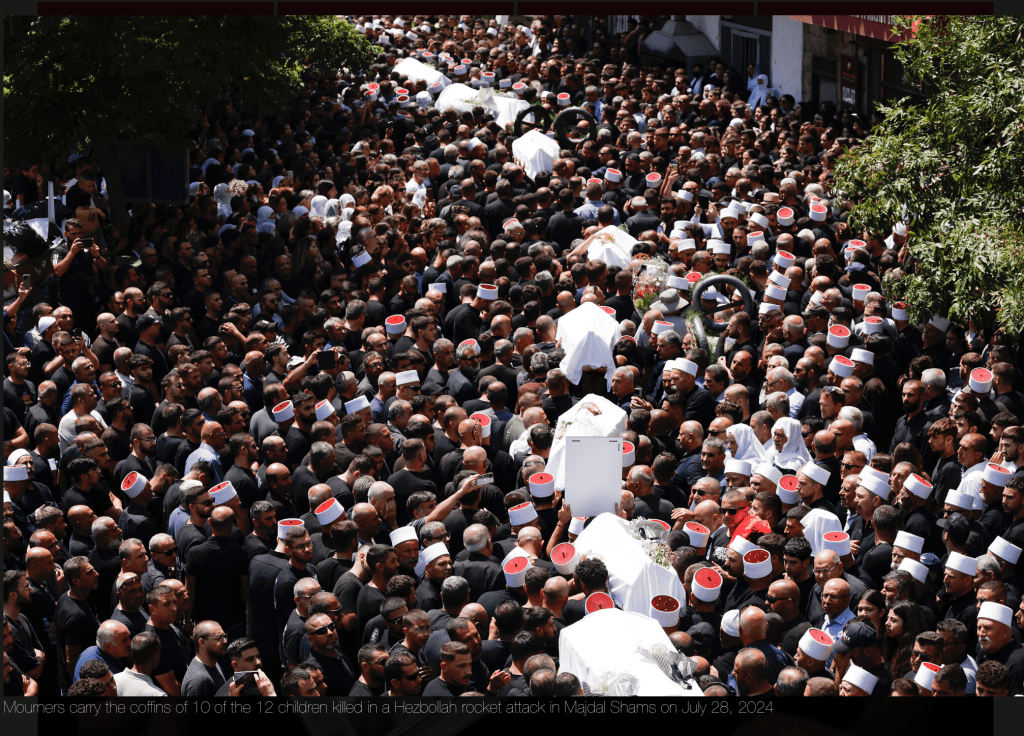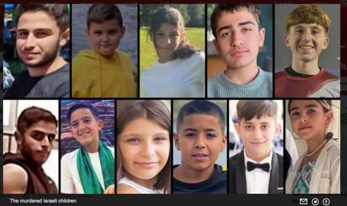 Elf Kinder und Jugendliche, die Opfer des bisher tödlichsten Angriffs der Hisbollah wurden. Die Rakete, eine im Iran produzierte Falaq-1, mit 53 kg Sprengstoff beladen, war gestern Nachmittag auf einem Fussballplatz in Majdal Shams eingeschlagen und explodiert. Mehr als 30 Kinder und Jugendliche wurden teils schwer verletzt. Mindestens vier Kinder stammen aus einer Familie.