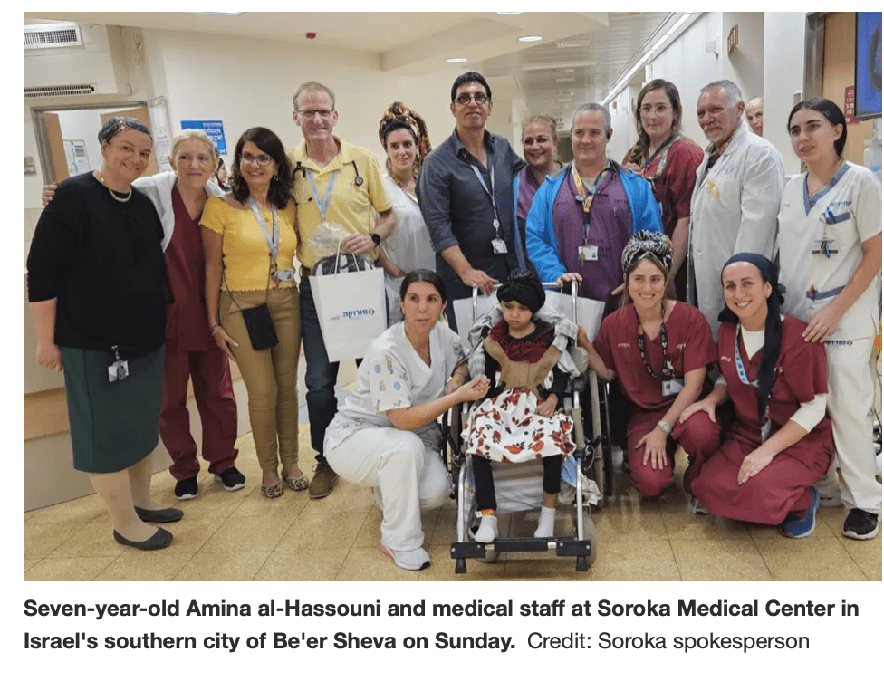 Die gute Nachrichte des Tages: Amina al-Hassouni, das 7 Jahre alte Beduinenmädchen aus dem unbewilligten Beduinendorf al-Fur’ah in der Nähe von Arat, konnte heute aus dem Soroka Krankenhaus in häusliche Pflege entlassen werden.