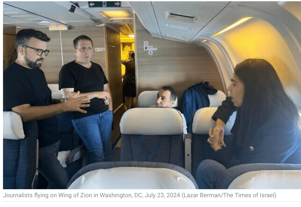Der hochgejubelte Jungfernflug der ‘Wing of Zion’ mit dem PM; samt seiner allgegenwärtigen Ehefrau, freigelassenen Geiseln und Familienangehörigen, Sicherheitskräften und 10 handverlesenen Journalisten an Bord, war dann doch nicht ganz das, was Lazar Berman, Journalist bei der Times of Israel sich vorgestellt hatte.
