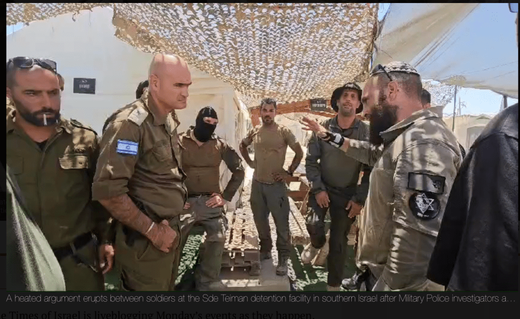 Es geht um den folgenden Vorfall: ein palästinensischer Häftling, der sich im militärischen Gefängnis-ähnlichen, nennen wir es Gefangenen-Lager befindet, wird von neun Soldaten der IDF gefoltert.