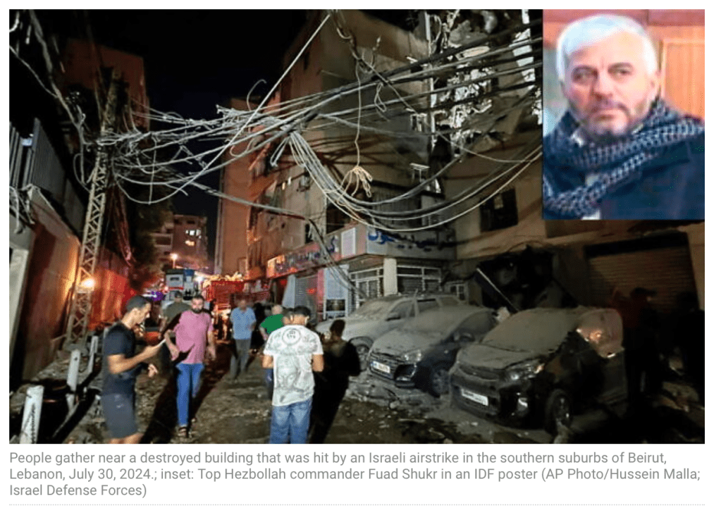 Gestern Abend hat die IAF ein Gebäude in Dahieh, im Süden Beiruts angegriffen, in dem sich der ranghöchste Militärkommandant der Hisbollah-Terror-Organisation, Fuad Shukr, aka Sayyid Musan, aufhielt. Shukr war verantwortlich für den tödlichen Angriff auf das Drusendorf Majdal Shams vom vergangenen Samstag, bei dem mindestens zwölf Kinder getötet und mehr als 30 teils schwer verletzt wurden. Die Hisbollah hatte die Verantwortung für den Beschuss abgewiesen. Jedoch konnte aufgrund der aufgefundenen Bestandteile sofort geklärt werden, dass es sich um eine iranische Rakete gehandelt hatte.