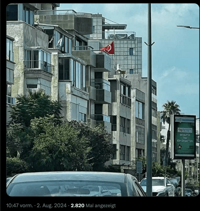 Am Botschaftsgebäude wurde die türkische Flagge auf Halbmast gesetzt. Damit wird ein Zeichen der Trauer um den Mann gesetzt, der für die grausame Ermordung von hunderten zivilen Israelis verantwortlich ist. Das ist beschämend! Der rechtsextrem-nationalistische Ben-Gvir sagte dazu: «Die Botschaftsangehörigen sind eingeladen, die Flagge gänzlich einzuholen und nach Hause zu gehen.»
