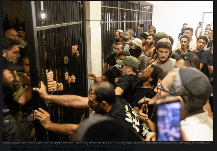 MK Limor Sonn Har-Melech, Otzmah Yehudit, schwingt sich zur Verteidigung eines Reserve-Soldaten auf, dem angelastet wird, schwere Sodomie im Sinne von Vergewaltigung, Körperverletzung unter erschwerten Umständen, Misshandlung unter erschwerten Umständen bei einem palästinensischen Gefangenen ausgeübt zu haben. Hinzu kommt noch der Vorwurf des unwürdigen Verhaltens eines Soldaten. Die Anklage wurde laut, nachdem bei dem Gefangenen schwere Verletzungen diagnostiziert worden waren. Zunächst waren insgesamt neun Reserve-Soldaten in Sde Teiman festgenommen und anschliessend in Beit Lid vernommen worden. Acht von ihnen wurden zwischenzeitlich in Hausarrest entlassen.