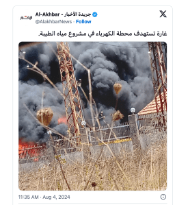 Libanesische Medien berichten soeben, dass ein kleines Kraftwerkt auf dem Gelände einer Wasserversorgungsanlage im südlibanesischen Taybeh von der IAF beschossen wurde. Beide Anlagen seien stark beschädigt worden. Eine Stellungnahme der IDF steht noch aus.