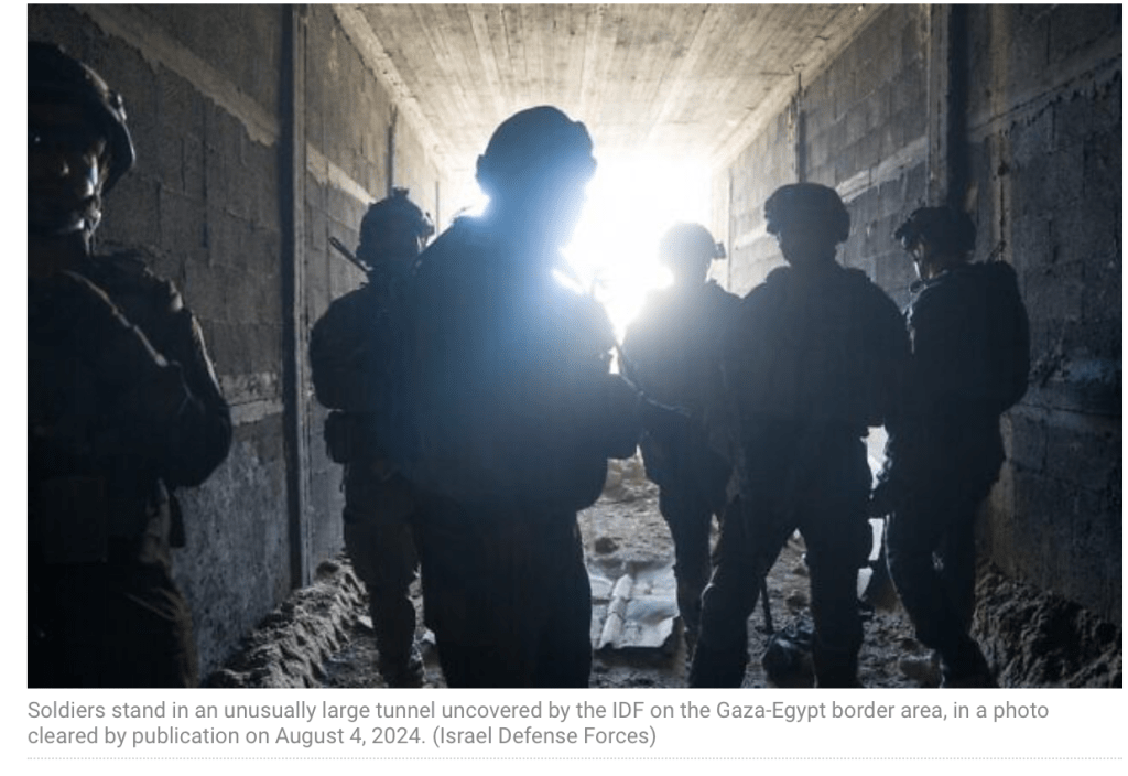 Die IDF hat heute einen Tunnel entdeckt, der gross genug ist, um mit einem grossen Wagen befahren zu werden. Der Tunnel befindet sich im Grenzbereich zwischen. Ägypten und Gaza. In der Breite misst er drei Meter und dürfte vor allem Schmuggelzwecken gedient haben. Vor der Zerstörung wurde er von Kampfeinheiten der IDF untersucht. Im Bereich des Philadelphi-Korridors, der aus sicherheitstechnischen Gründen weiterhin von der IDF besetzt bleibt, wurden Dutzende Tunnel gefunden und zerstört, insgesamt 25 von ihnen liefen unterhalb der Grenze zwischen den beiden Staaten.