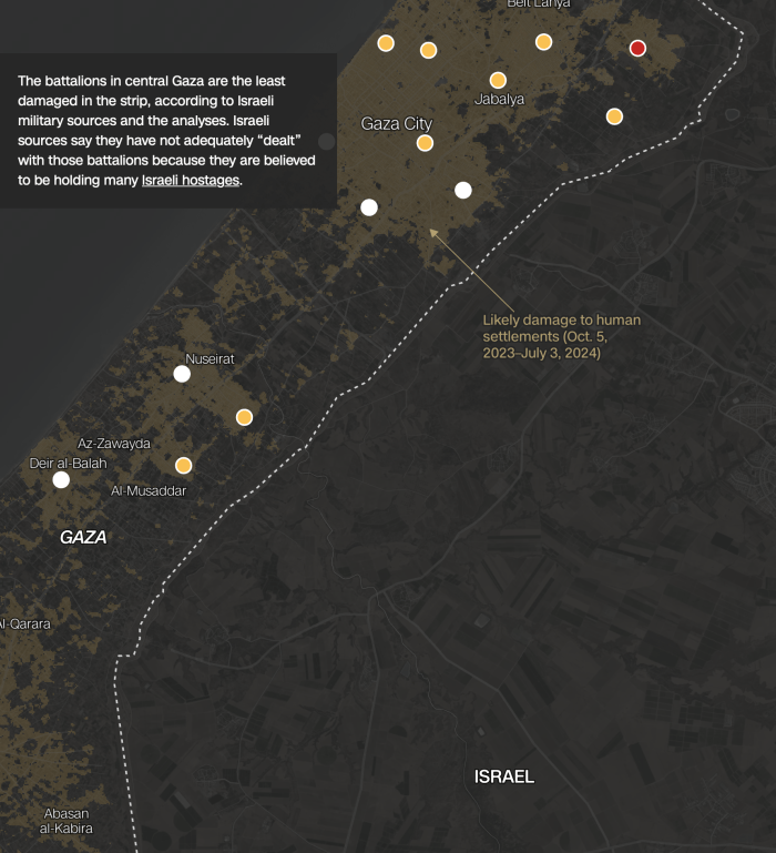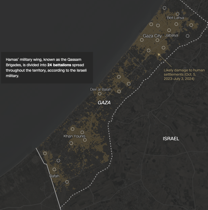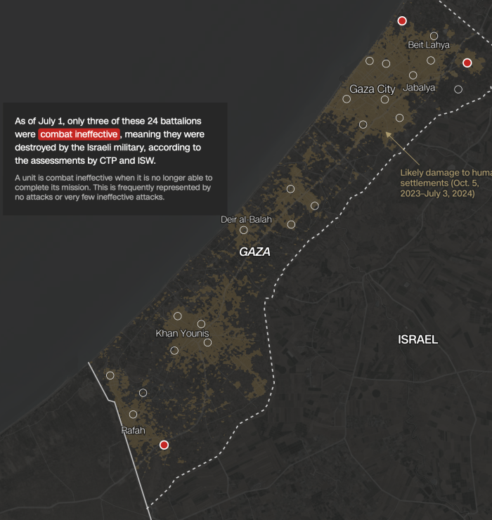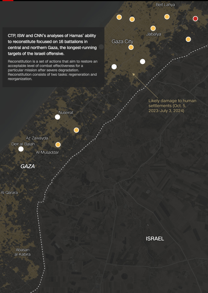 CNN berichtet heute in einer Online-Präsentation, dass die Aussagen von Netanyahu, man sei dem Sieg über palästinensische Terror-Organisation ‘sehr nahe’, gelogen sind. Nicht nur, und das lesen wir täglich in den Medien, die Terror-Einheiten sich überall dort wieder neu formieren, wo die IDF bereits davon gesprochen hat, dass das Gebiet entmilitarisiert sei. Das Büro des PM hat nicht auf die entsprechenden Fragen und Hinweise durch CNN reagiert. Nachfolgend einige selbsterklärende interaktive Grafiken: