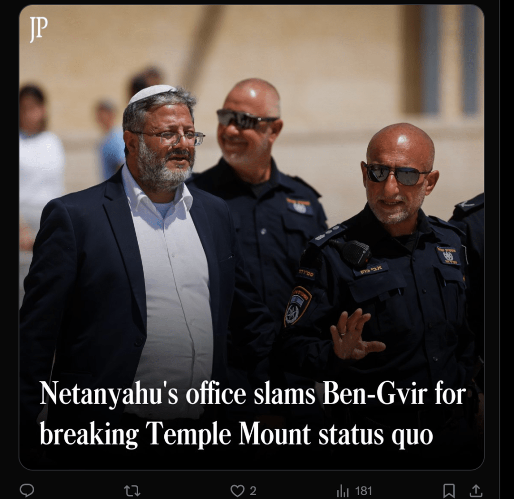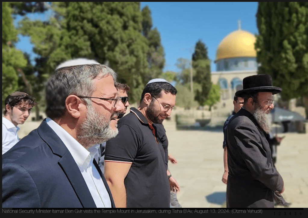 In einer weiteren überflüssigen Provokation hat sich der rechtsextrem-faschistische Ben-Gvir heute, am Tish’a beAw, wieder auf dem Tempelberg begeben. Am 9. Aw trauern wir um verschiedene Katastrophen, die uns an diesem Datum während der letzten 2.500 Jahren getroffen haben (s. Dwarim, 9. August 24). Er wurde begleitet von seinem Parteikollegen Yitzhak Wasserlauf, etwa 2.000 Besuchern, darunter zahlreiche Siedler. Später kam noch ein MK des Likud dazu. Selbstverständlich durfte auch der wohlbekannte Rebbe nicht fehlen, der sicherstellen muss, dass nicht irgendwer irrtümlich auf den Ort tritt, unter dem man den Standort der Bundeslade mit den Gesetzestafeln vermutet. In verschiedenen Video-Clips, die in den sozialen Netzen verbreitet wurden, ist zu sehen und auch zu hören, wie laute Gebete gesprochen werden. Das ist seit 1967 im ‘status quo’, ausgehandelt zwischen Israel und Jordanien, betreffend den Tempelberg, verboten. Ben-Gvir ist der Ansicht, dieser Status müsse dringend aufgeweicht oder besser, ganz abgeschafft werden. Die Polizei war zwar anwesend, schritt aber nicht ein. Es gab auch keine Festnahmen, die zu erwarten gewesen wären.
