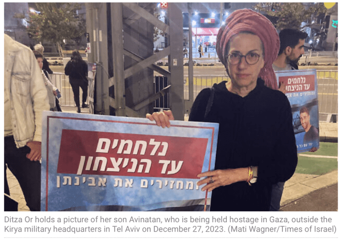 Ditza Or gehört zu einer der kleineren Gruppen von Familienangehörigen, die überzeugt sind, dass die Geiseln nur mit erhöhtem militärischem Druck und nicht mit Verhandlungen zurückgebracht werden können. Ihre Kritik am bisherigen Versagen der Verhandlungen geht mehr in Richtung Militär als in Richtung Regierung.