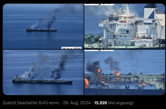 Der unter griechischer Flagge segelnde Öltanker ‘Sounion’, der von den Houthi-Terroristen manövrierunfähig geschossen wurde, brennt immer noch. Die Brände befinden sich an fünf verschiedenen Orten des Schiffes. Obwohl er mit 150.000 Tonnen Rohöl beladen ist, gibt es noch keine Anzeichen eines Ölteppichs. Das Schiff liegt nach wie vor in internationalen Gewässern vor Anker.