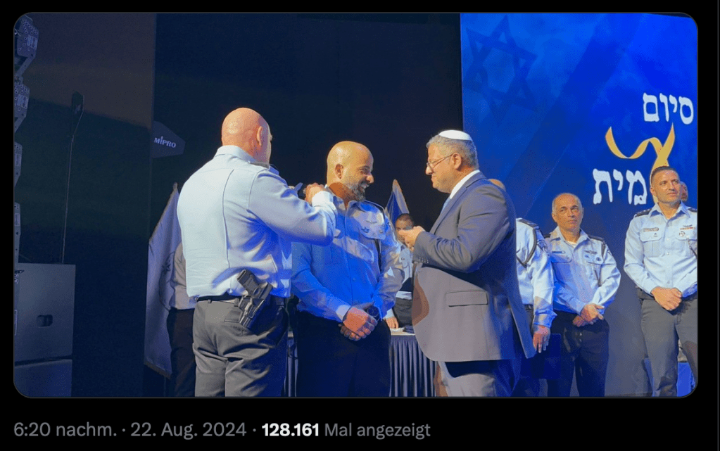 Dieser völlig aus dem Ruder gelaufene, aggressive und verantwortungslose Polizist wurde nun von Ben-Gvir beförderte und zum Polizeichef einer der demografischen Brennpunkte Israels ernannt. Ben-Gvir lobte den Beamten und verurteilte den Druck «der auf einen Polizeibeamten ausgeübt wurde, der offenbar gemäss den ihm erteilten Anweisungen gehandelt hat. Ich stehe hinter dir!» Nota bene: Ben-Gvir ist der Chef der Polizei und daher der Einzige, der Anweisungen geben kann!