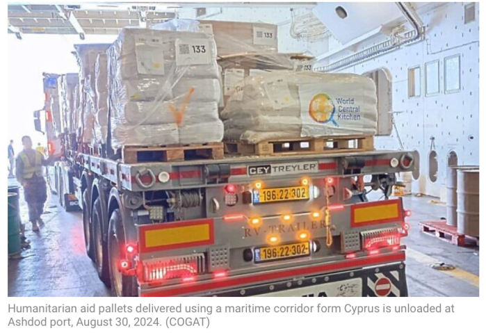 Die gute Nachricht des Tages: Im Hafen von Ashdod sind 3.577 Paletten mit Hilfsgütern für Gaza auf dem Seeweg von Zypern angekommen. Die Hilfsgüter stammen aus Spenden von internationalen Hilfsorganisationen. Es wurde bereits mit dem Löschen der Ladung und dem Umladen zur Weiterfahrt nach Gaza begonnen.