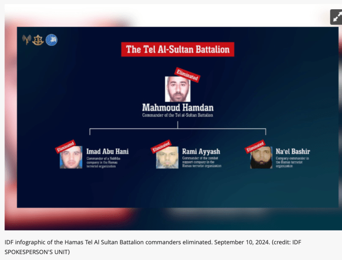 Gestern wurde der Hamas-Kommandant des ‘Tel-Sultan-Bataillons’ gemeinsam mit drei weiteren Terroristen in der Nähe von Khan Younis neutralisiert. Der Kommandant des Bataillons, Mahmoud Hamdan, und drei weitere ranghohe Terroristen wurden bei dem Angriff ebenso wie weitere 19 Terroristen ausgeschaltet. Damit ist das Bataillon weitgehend ohne Führungsspitze.