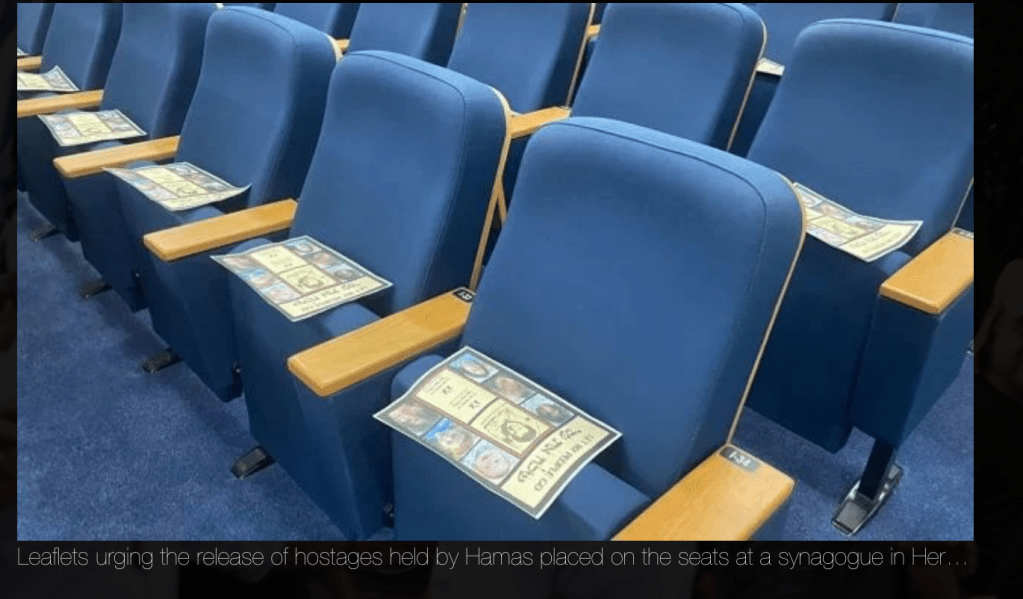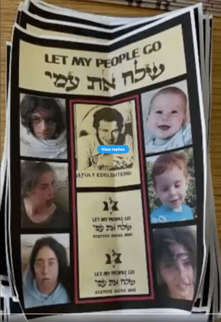 Die Flugzettel zeigten die Bilder der vier Soldatinnen, die von der Militärstation der Einheit 8.200 in Nahal Oz verschleppt worden waren. Dazu Bilder von Baby Kfir, 1 Jahr und seinem Bruder Ariel, 5, die mit ihren Eltern aus dem Heimat-Kibbutz Nir Oz verschleppt wurden. In der Mitte des Posters befindet sich ein Bild von Yuli Edelstein in seinem Gefängnis in Moskau, versehen mit der Unterschrift «Let my people go».