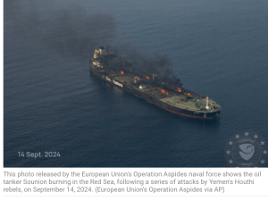 Der von den Houthi-Terroristen angegriffene und manövrierunfähig geschossene Oel-Tanker Sounion brennt immer noch. Nach den ersten Angriffen, bei denen der Frachter stark beschädigt wurde, enterten die Terroristen vor einigen Wochen den Frachter und legten noch zusätzliche Brände. Er konnte jetzt von Bergungsmännern erfolgreich in einen sicheren Bereich in internationalen Gewässern geschleppt werden, ohne dass das gebunkerte Oel, eine Million Barrel Rohöl, eine Verschmutzung des Meeres auslöste.