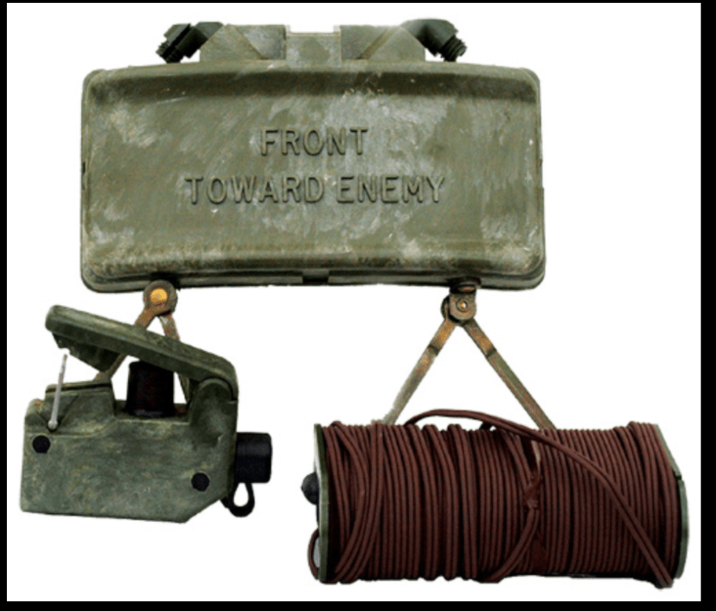 [1] Die Claymore-Mine ist eine Landmine mit ‘Richtsplitterladung’, die ab 1963 während des Korea Krieges eingesetzt wurde. Sie besteht aus einem Aussengehäuse aus Kunststoff und ist gefüllt mit kleinen Stahlkügelchen. Vom Gesamtgewicht von etwa 1.6 kg sind etwa 700 gr. Stahlkügelchen. Sie kann sowohl defensiv eingesetzt werden, aber auch bei Angriffen.