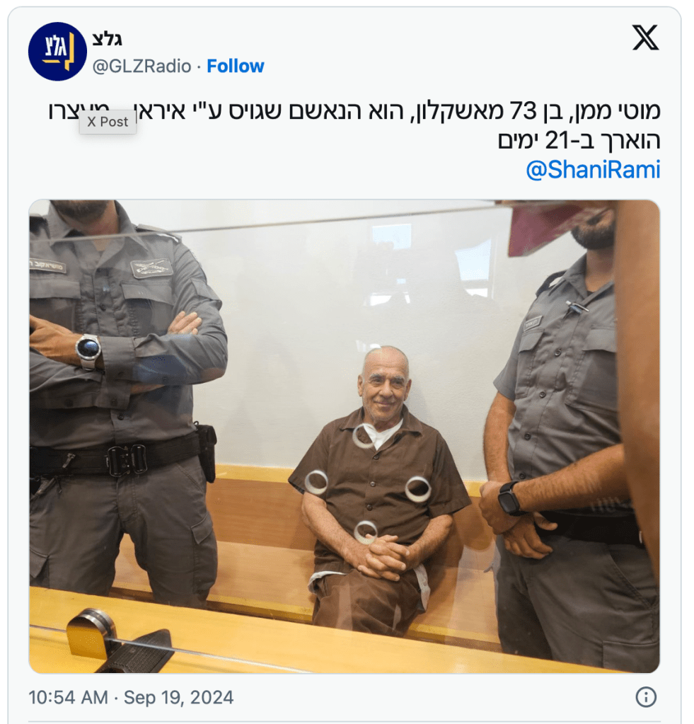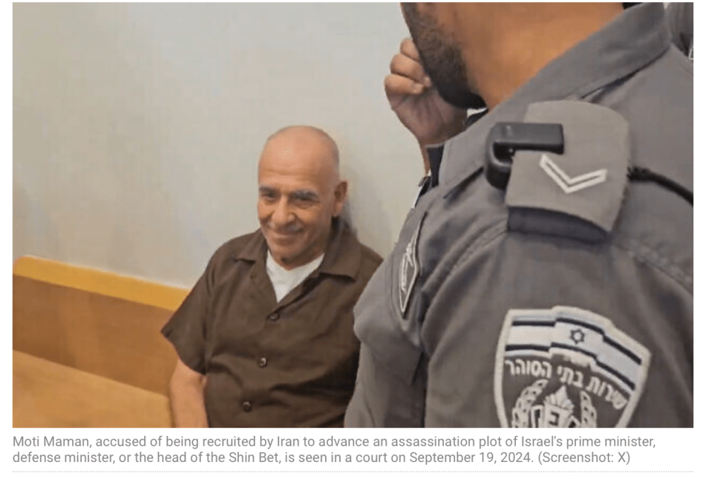 Ein 73 Jahre alter Israeli, Moti Maman aus Ashkelon, wurde im vergangenen Monat verhaftet. Ihm wurde vorgeworfen, vom Iran angeworben worden zu sein, um ein Attentat auf den PM, den VM oder den Chef des Shin Bet zu verüben. Laut Aussagen des Shin Bet wurde er zweimal in den Iran eingeschleust und erhielt dort eine Bezahlung für die Durchführung der ‘Aufträge’. Maman wurde am Donnerstag angeklagt.