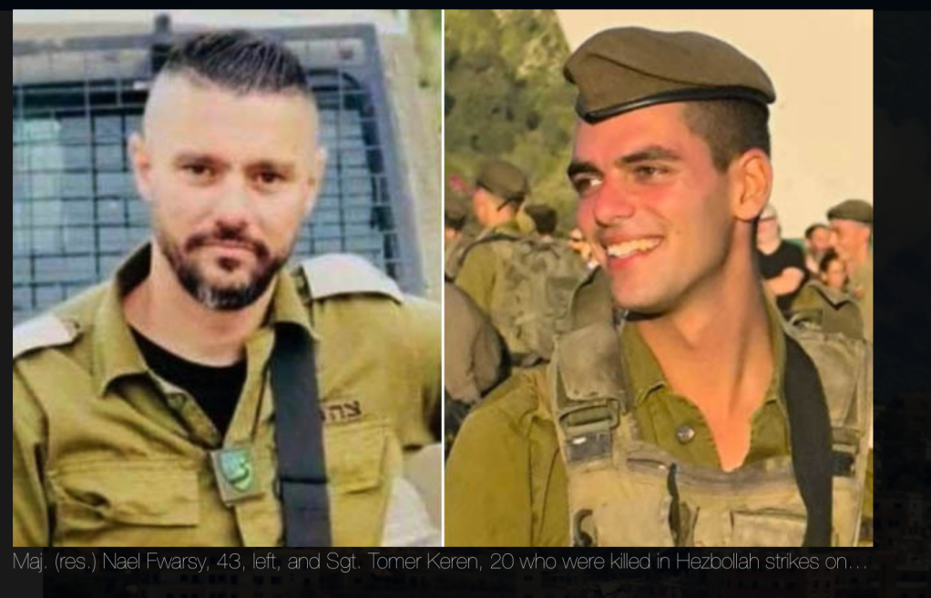Die IDF muss heute erneut den Tod zweier Soldaten bekannt geben. Maj. (res.) Nael Fwarsy, 43, und Sgt. Tomer Keren, 20, s“l, verloren ihr Leben beim Drohnenangriff in Ya’ara und beim Beschuss mit einer Panzer-Abwehr-Rakete.