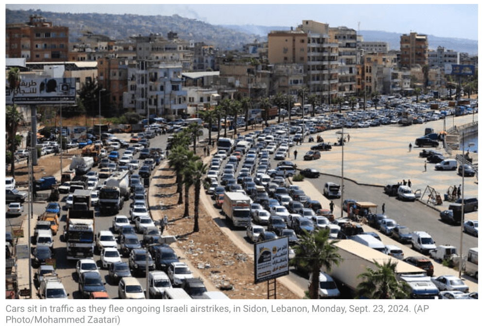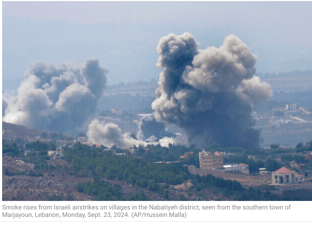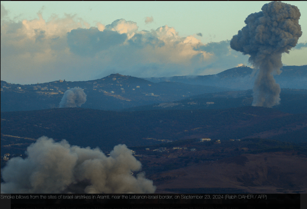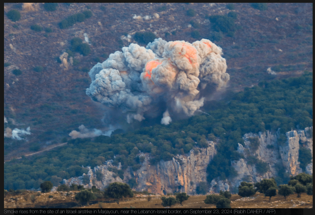 Der Arabisch sprechende Sprecher der IDF, Avichay Adraee, warnt die Bevölkerung des Libanon, dass Häuser, in denen die Hisbollah Waffen versteckt, in Kürze zerstört werden. Die Zivilisten wurden intensiv aufgefordert, sich sofort von solchen Orten zu entfernen. Die IDF hat Textnachrichten an die Bewohner geschickt und sie von einer libanesischen Telefonnummer aus angerufen. Darin heisst es, die minimal sichere Entfernung betrage 1.000 m. Die Warnung gilt für den gesamten südlichen Libanon. Die UNIFIL, deren Blauhelme im südlichen Libanon stationiert sind, wurden aufgefordert, sich zu einem halbwegs sicheren Gebiet nördlich des ‘Litani Flusses’ zu begeben. Der Litani Fluss wurde in der UNO-Resolution 1701 vom 11. August 2006 als die Grenze festgesetzt, hinter die sich die Hisbollah dauernd zurückziehen müsse. Die Resolution wurde von der Hisbollah nie umgesetzt. Vor einer Stunde, am frühen Nachmittag, ergänzte IDF-Sprecher Daniel Hagari, die Bewohner des Beqa’a Tales hätten zwei Stunden Zeit, Gebäude zu verlassen und sich von Gebäuden zu entfernen, in denen Waffen der Hisbollah gelagert werden. Die IDF werde, so erklärte er, jedes Gebäude angreifen, in dem Waffen vermutet werden. Die zwischenzeitlich erfolgten Angriffe zeigen Sekundär-Explosionen nach dem eigentlichen Angriff. Das beweist, dass in dem angegriffenen Gebäude Waffen gelagert waren.