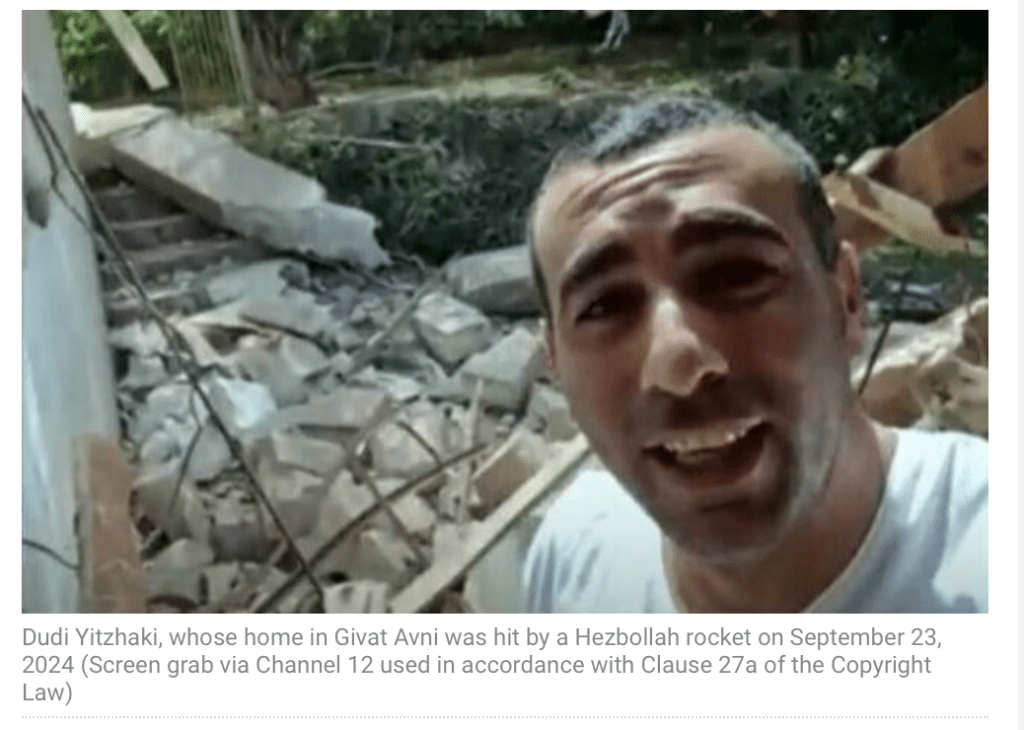 Dudi Yitzhaki, dessen Haus heute in Givat Avni einen Volltreffer durch eine Rakete aus dem Libanon erhielt, kann sein Glück noch nicht fassen. «30 Sekunden und 3 cm haben heute unser Leben gerettet.» Als der Alarm ausgelöst wurde, seien sie sofort in den Schutzraum des Hauses gerannt und hätten die Türe vorschriftsmässig geschlossen. Kurz darauf erfolgte eine unglaubliche Explosion, die zeigte, dass der Einschlag der Rakete unmittelbar in der Nähe des Schutzraums erfolgte. Seine Bitte an alle, ist, die Türen immer vorschriftsmässig zu verschliessen, das hätte ihnen das Leben gerettet!
