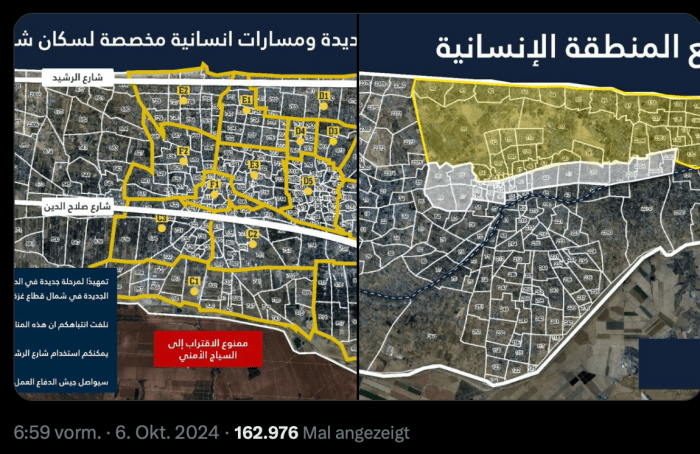 IDF-Sprecher Avichay Adraee erklärte heute die neuen Evakuierungspläne für die immer noch im Norden des Gazastreifens befindlichen Zivilisten. «Die terroristische Hamas versucht weiterhin, ihre Strukturen in der Region zu etablieren, wobei sie die Bevölkerung, Unterkünfte und Gesundheitseinrichtungen als menschliche Schutzschilde ausnutzt. Der nördliche Gazastreifen gilt immer noch als gefährliches Kampfgebiet. Nutzen Sie die beiden sicheren Strassen Rashid al-Bahr und al-Din, um sich in den Süden zu begeben. Die humanitäre Sicherheitszone wurde erweitert. Wir werden weiterhin gewaltsam gegen die Terror-Organisationen vorgehen, wo immer sie sich befinden.»